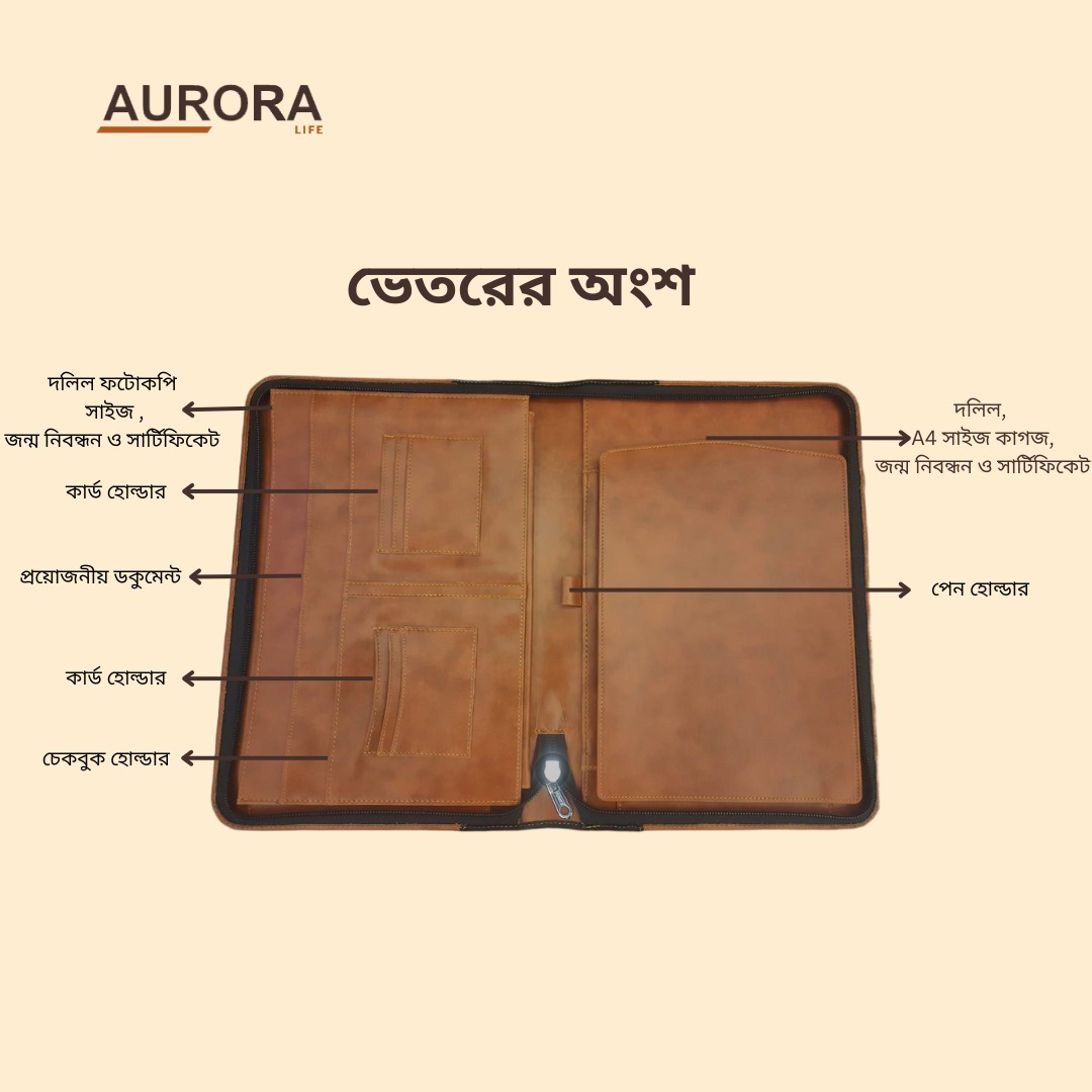 অরোরা প্রফেশনাল ডকুমেন্ট অর্গানাইজার দিয়ে আপনার বাসা বা অফিসের গুরুত্বপূর্ণ নথি, যেমন NID, সার্টিফিকেট, দলিল, এবং ফাইল, নিরাপদ ও গুছিয়ে রাখুন। এটি কাগজপত্র সুরক্ষার পাশাপাশি স্টাইলের নিশ্চয়তাও দেয়। প্রয়োজনীয় নথি হারানো বা ক্ষতির ঝামেলা এড়াতে এখনই ব্যবহার শুরু করুন।